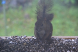 身体は人一倍小さいのに、度胸があって、すぐ近くに行っても、ギィー ギィーと逆に人間を威嚇する。今までで最大50センチまで接近してみたが、すごく怒るばかりで、一向に逃げる気配なし。知り合いの喫茶店では、手のひらにひまわりの種を持って歩くと、「よこせ!」と手にアタックを敢行するらしい。 |