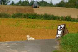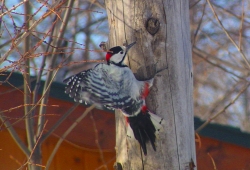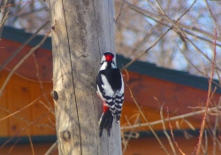 旅行者の方は、ちょっとした林の中に入って周囲を見回せば、観れる可能性が高いと思います。しかし、何でもかんでも(そんなとこ穴あけても餌なんて絶対ないから!と思うようなとこまで)突付くので、家の壁に何箇所か大きな穴を開けられました(しかも、当然手の届かない高いとこに・・・)。うちにお泊り頂いたお客様で、早朝大工さんが超高速で釘を打っているんだなあと、目を覚まされましたら、コイツですので、どうか大目にみて下さいます様、お願い申し上げます。 |